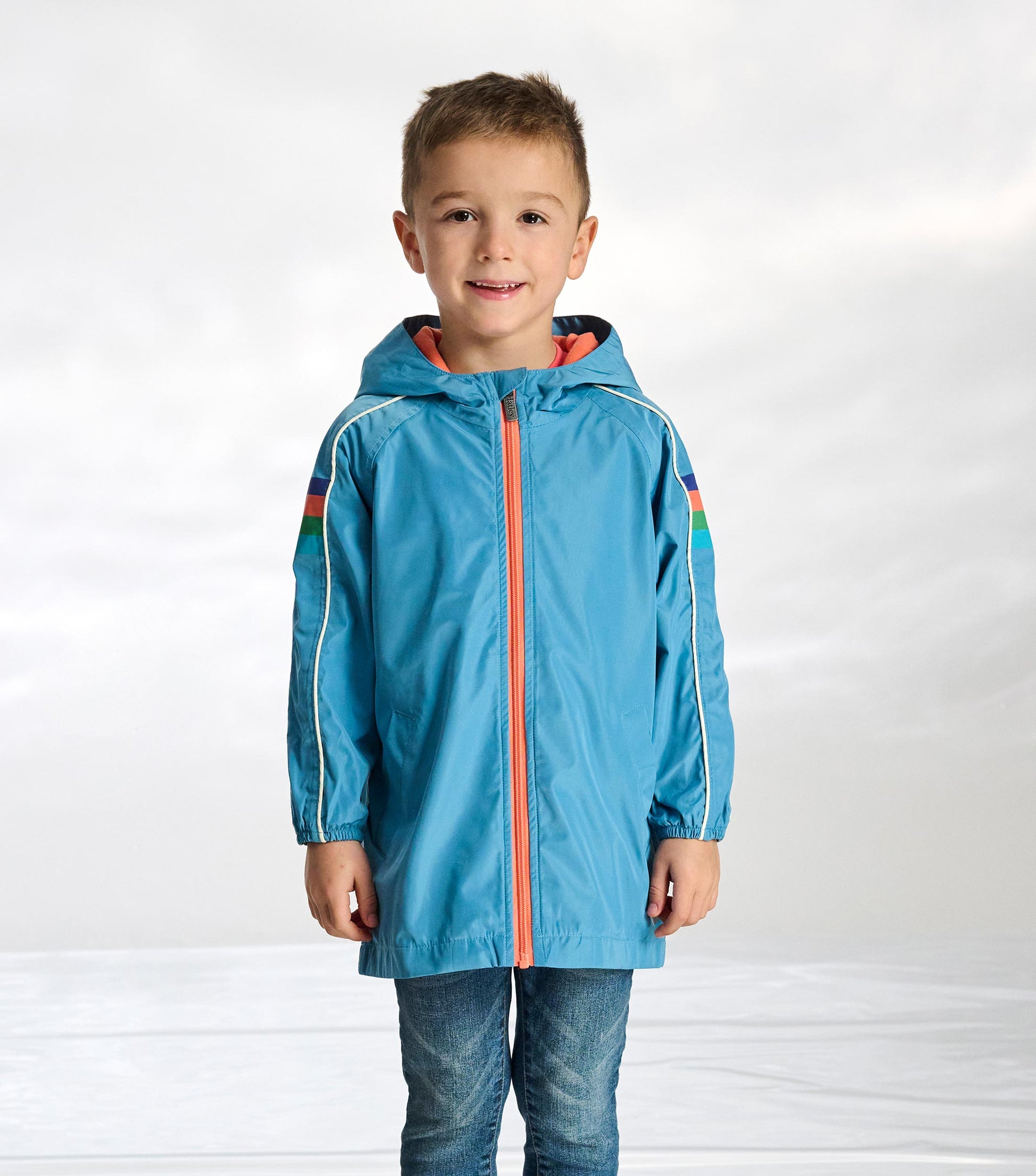 This waterproof jacket in refreshing Niagara blue keeps him dry during unexpected showers. The cozy jersey lining adds warmth while sporty piping details create athletic style. Snug elastic cuffs seal out wind and rain while the protective hood provides coverage. An easy-zip front with chin guard makes getting ready quick and comfortable. Perfect for active boys who don't let a little rain slow them down.