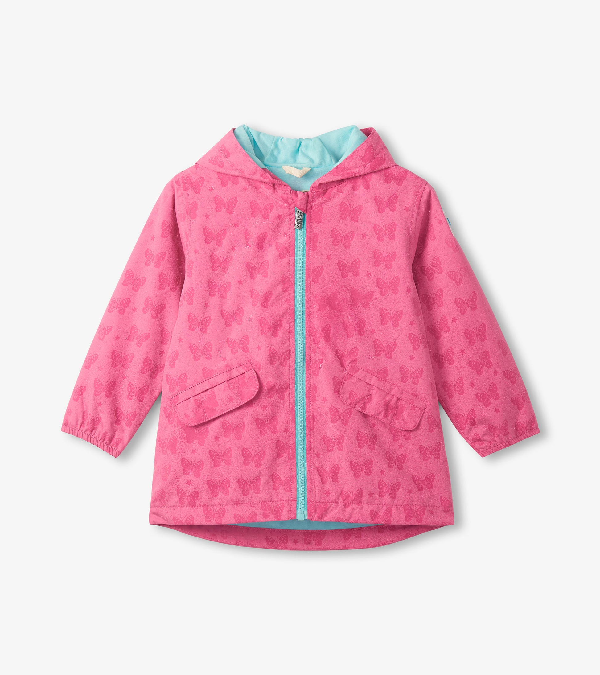 Watch beautiful butterflies appear like magic when rain hits this incredible color-reveal jacket. The waterproof construction keeps her dry while the cozy lining provides comfortable warmth. Elasticated sleeves and protective hood seal out wind and rain effectively. Secure snap-flap pockets protect belongings from unexpected showers. She'll actually hope for rain to see the hidden butterfly design come alive.