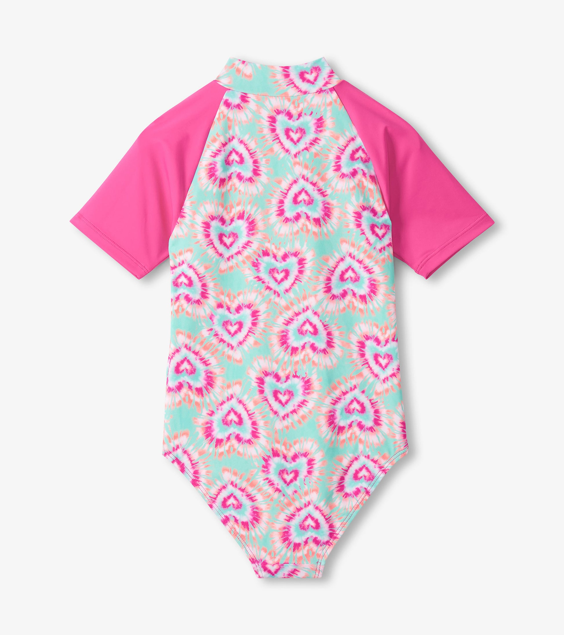 This rashguard swimsuit gives kids extra sun coverage while keeping the look sweet and playful. The aquamarine collar and torso are covered in an all-over magenta, white, and orange tie-dye heart pattern, paired with dark pink sleeves for a bold pop of colour. A dark pink front zipper with a zipper guard adds both function and comfort. The stretchy knit lets kids move freely, whether swimming or playing on the shore, while quick-dry performance helps reduce chill after water breaks. It also holds up well to chlorine and saltwater for long-lasting wear.