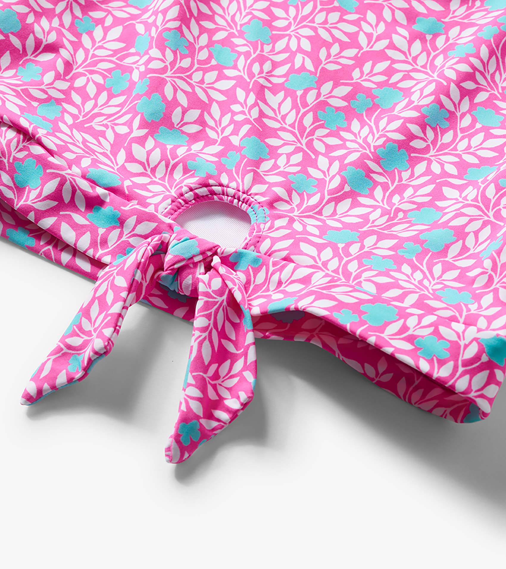 This two-piece delivers playful colour with a tie-front touch that makes it extra fun. The flexible nylon–spandex blend keeps kids comfortable through every splash and activity, and quick-dry performance helps them transition smoothly out of the water. The fabric stays strong and vibrant through both chlorine and saltwater exposure. The top and the waistband of the bottoms feature a pink base with a white floral pattern and turquoise accents, while the neckline is in turquoise and pink stripes. The bottoms themselves are striped in white, pink, and turquoise for an extra pop of summery charm.