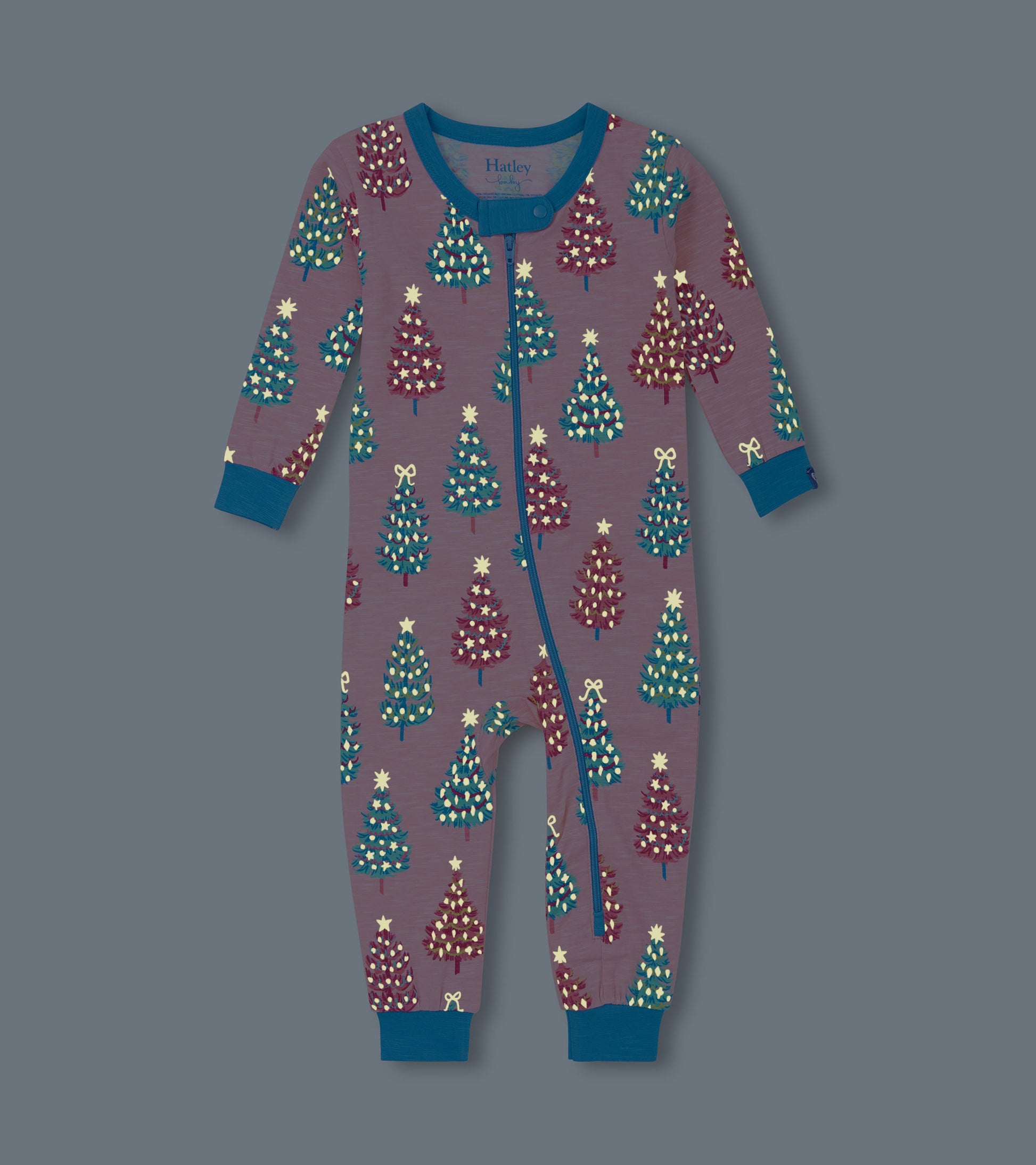 Bring whimsical holiday charm to bedtime with the Baby Girls Pink Bottle Brush Trees Cotton Sleeper, made from 100% cotton for soft, breathable comfort. This footless, tight-fitting sleeper features a cheerful print of Christmas trees in pink, blue, and green, each adorned with ornaments, ribbons, and stars, set against a cozy heathered pink background. With long sleeves, a round neckline, and vibrant blue cuffs at the wrists and ankles, it blends festive flair with thoughtful design. The front zipper extends from neck to leg for easy changes, and includes a zipper guard and snap tab for added comfort and security.