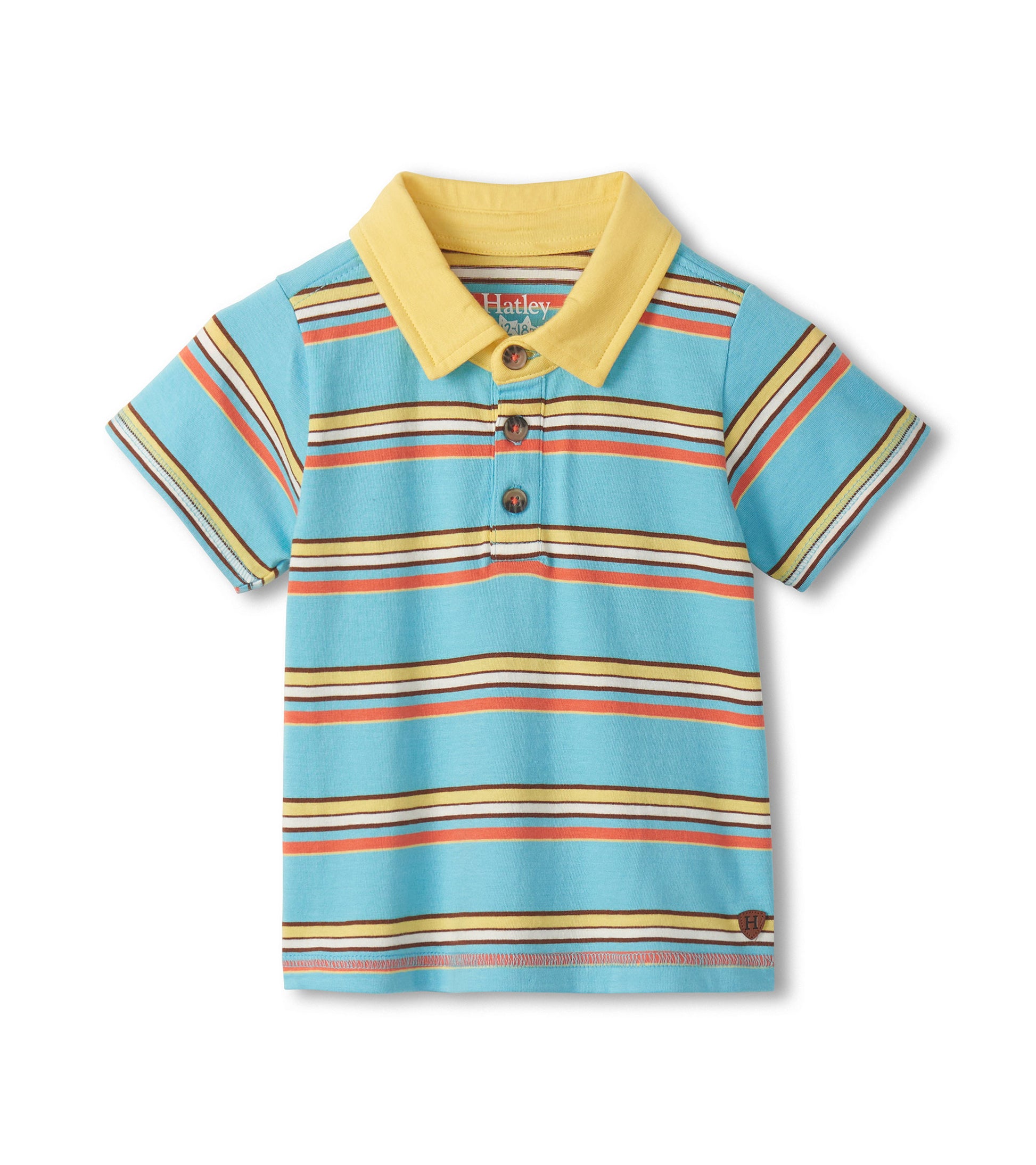 Add a burst of colour to their wardrobe with this polo! Made from ultra-soft peached jersey fabric, this short-sleeve polo brings classic comfort with a playful twist. The bright aqua-blue base is energized by horizontal stripes in mustard yellow, coral orange, cream, and brown. A traditional collar and three-button front keep the look timeless, making it an easy pick for everything from park playdates to family outings.