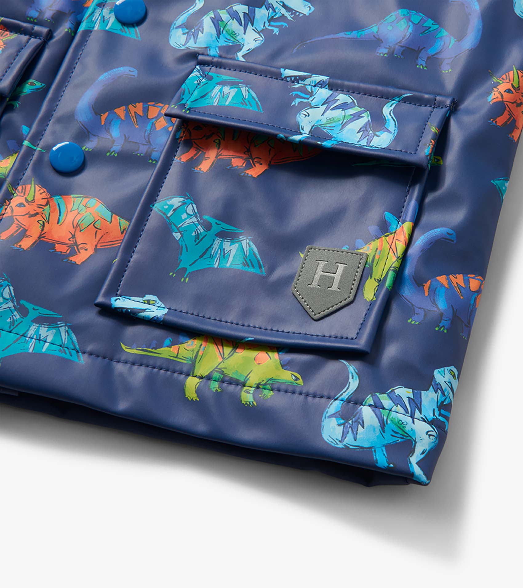 Playful dinosaurs party across this waterproof raincoat perfect for tiny paleontologists. Safe PVC-free materials keep harmful chemicals away from precious little ones. The soft comfortable lining provides cozy warmth while snap closures make dressing quick and easy. Functional pockets store treasures while the built-in loop simplifies closet organization. Your little dino fan will roar with excitement for rainy day walks.