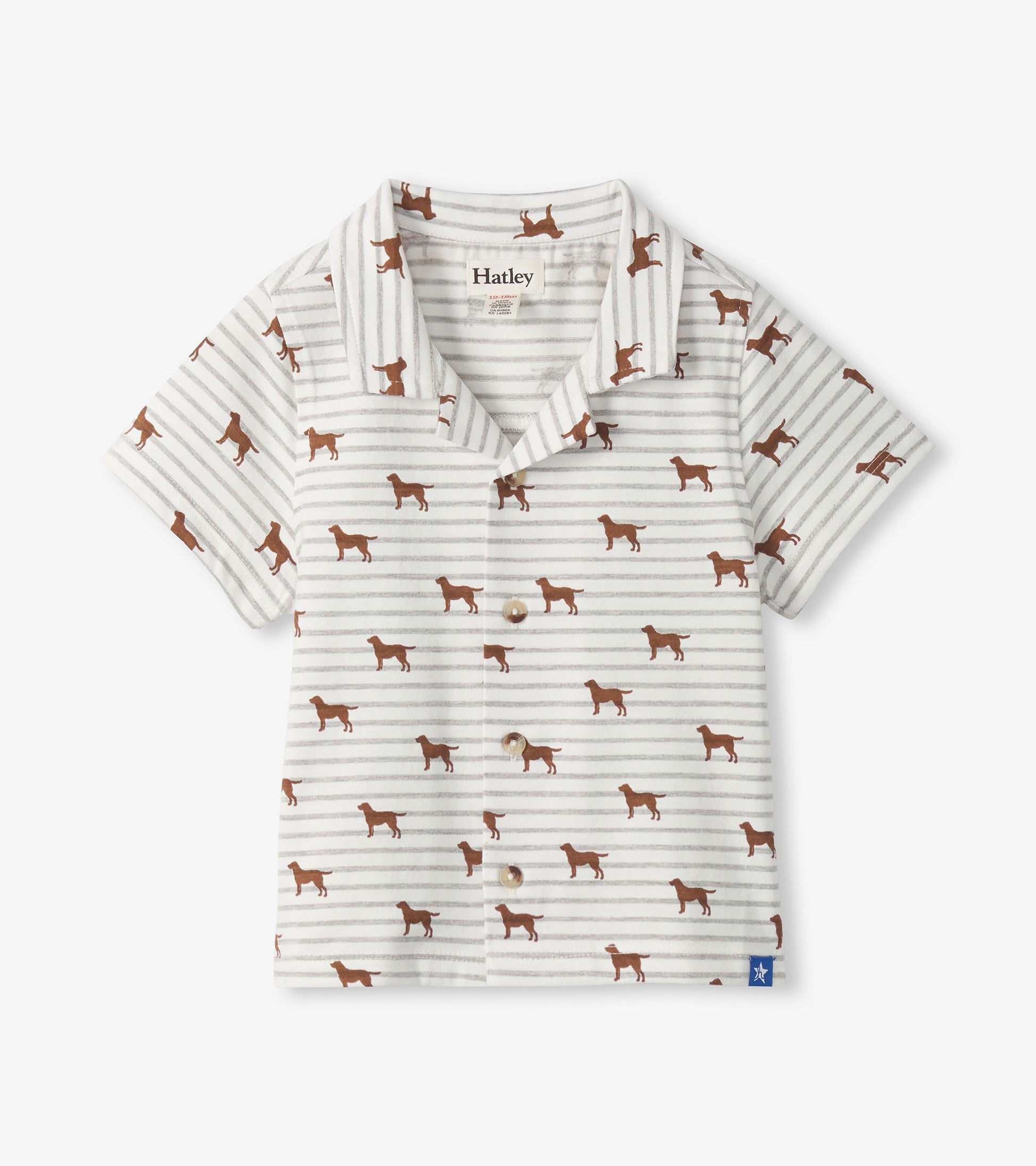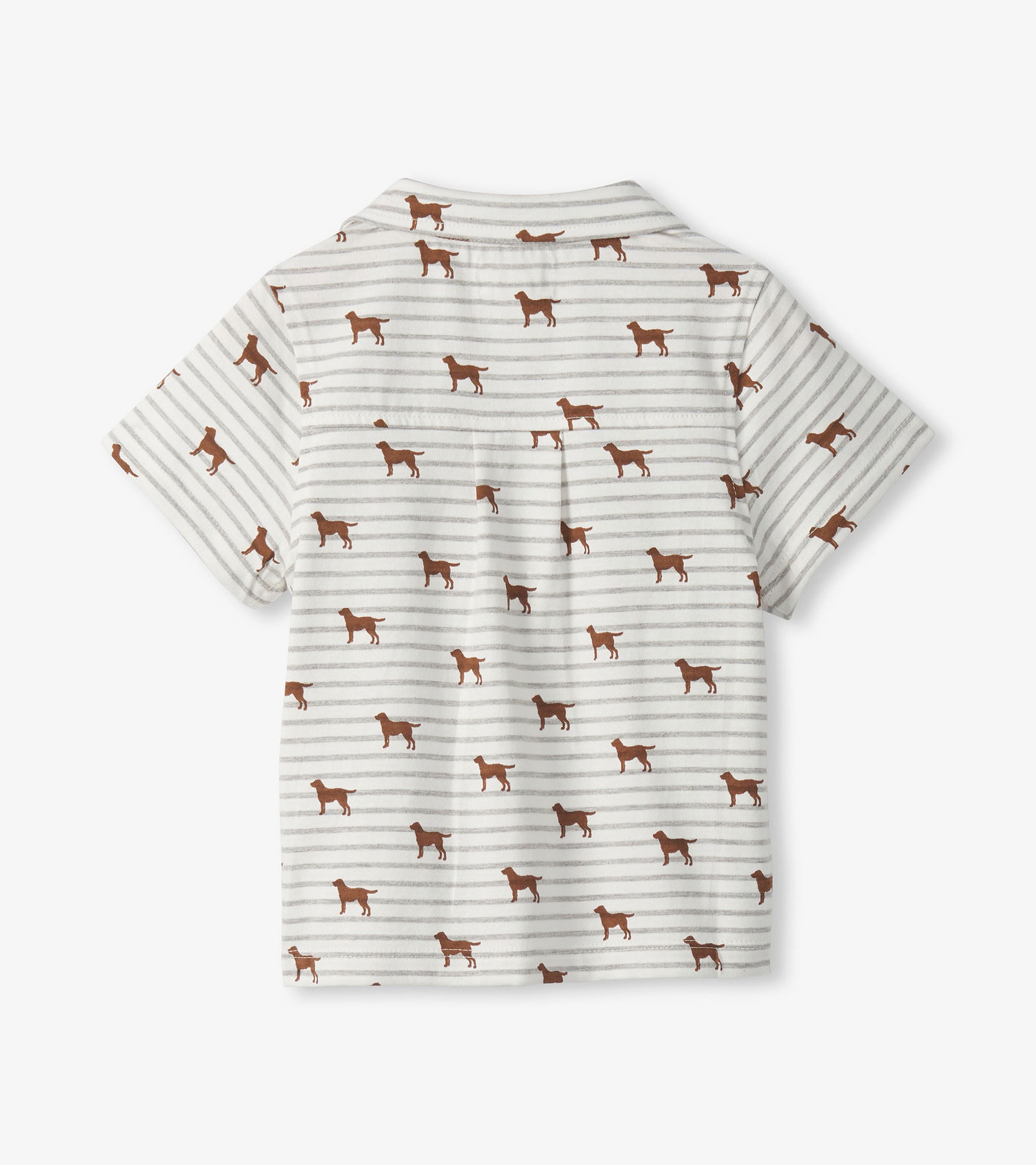 Adorable little pups make this jersey button-down shirt irresistibly cute. Soft cotton construction keeps your little one comfortable while looking polished for special occasions. The classic short-sleeve design stays cool during warm-weather events and celebrations. Easy care means this shirt bounces back beautifully after countless wears and washes. Perfect for puppy-loving babies who need to dress up in style.