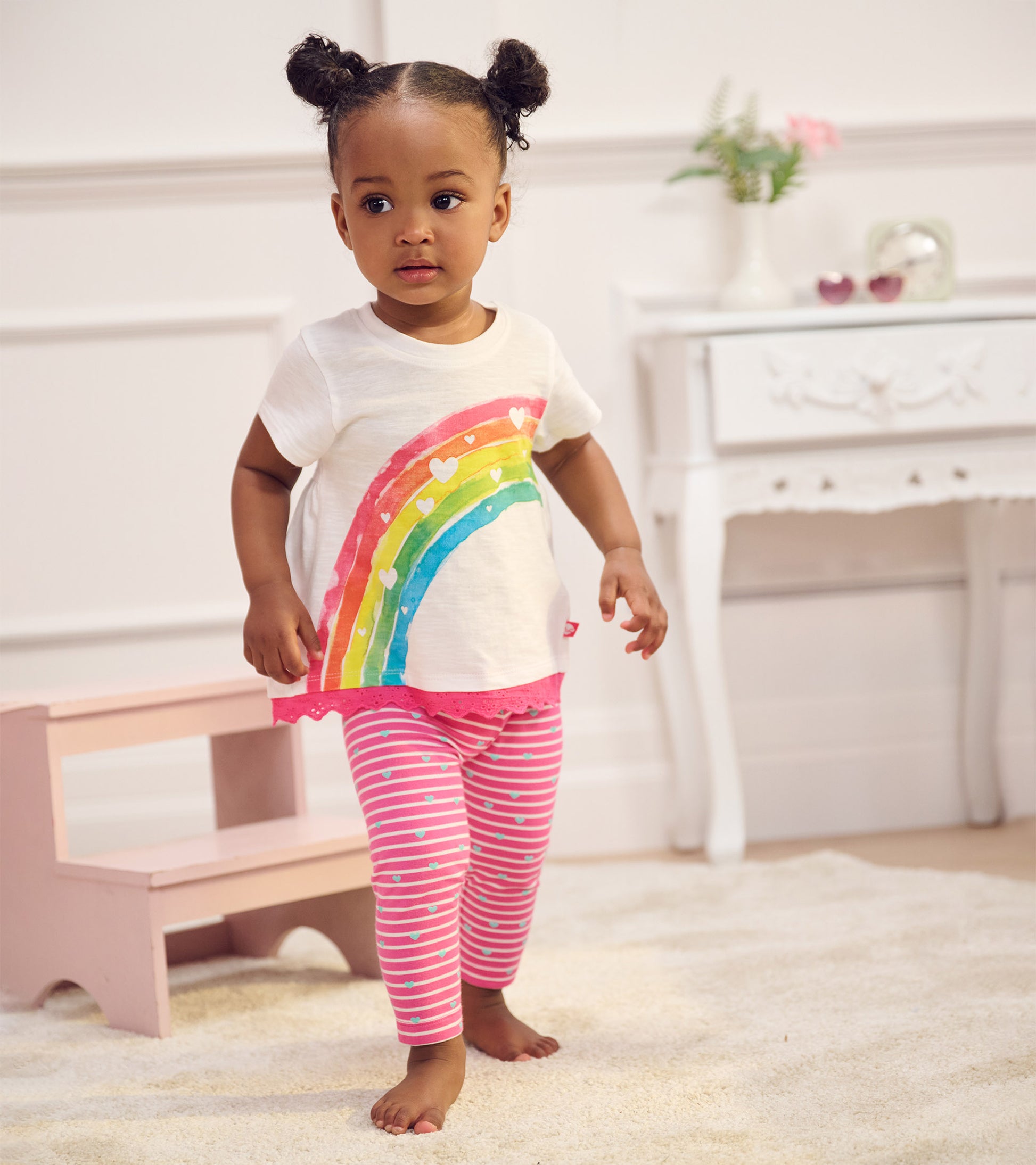 Brighten her day with the Baby & Toddler Girls Rainbow Eyelet Trim T-Shirt! This lightweight cotton tee showcases a vibrant rainbow design and dainty eyelet trim for a playful yet elegant look. Soft and breathable, it’s perfect for keeping her comfortable during busy days. Whether paired with leggings or shorts, this tee brings a cheerful vibe to any outfit.