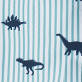 Plunge into prehistoric pool play with our boys dino stripes swim trunks! These white trunks feature blue stripes, a light green waist, and an all-over design of blue dinosaur silhouettes. Perfect for little dino lovers digging for fossils at the beach!