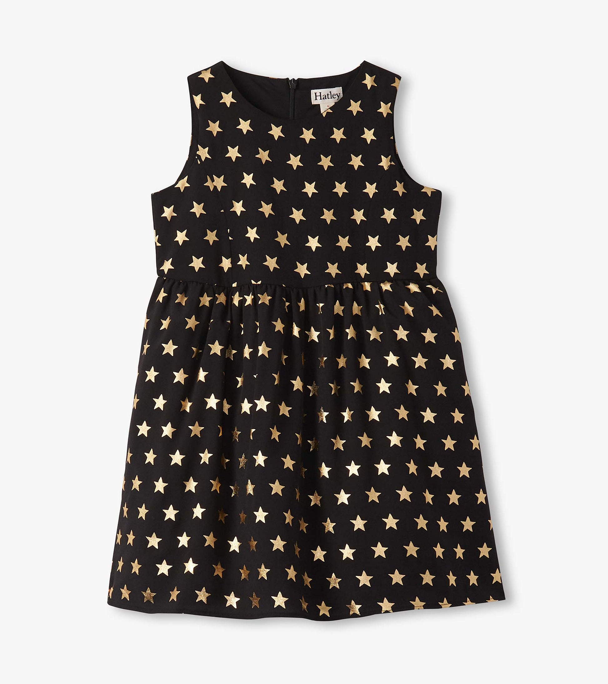 The Girls Gold Stars Princess Dress is a sparkling showstopper, crafted with a black crepe shell and cotton cambric lining for comfort and structure. Designed in a sleeveless A-line cut, it features a fitted bodice with front and back princess seams, a back zipper closure, and a gently gathered waist that flows into a flared skirt. Layers of tulle tucked between the shell and lining add volume and twirl-worthy charm, while an all-over gold metallic star pattern creates a magical, night-sky effect.