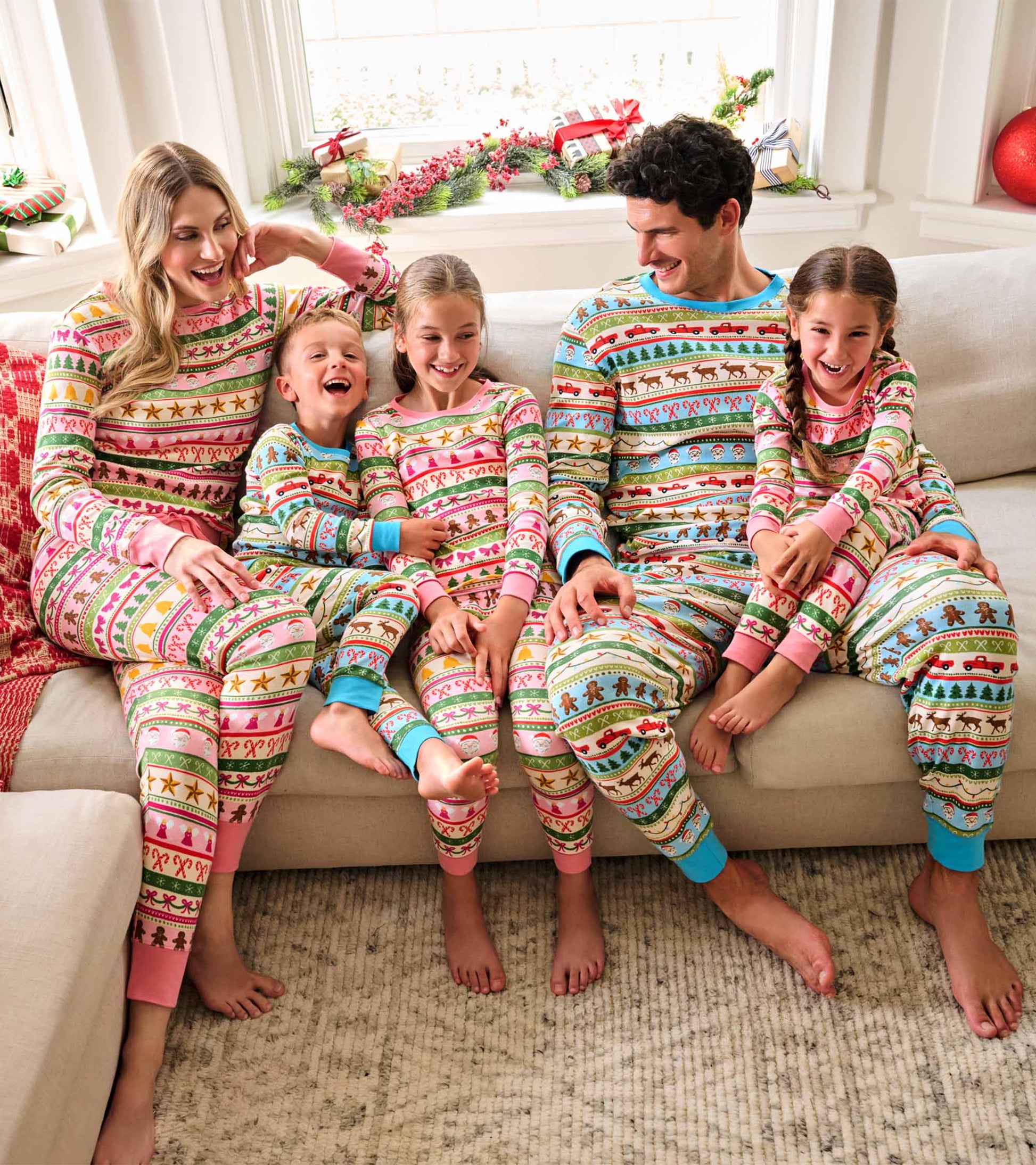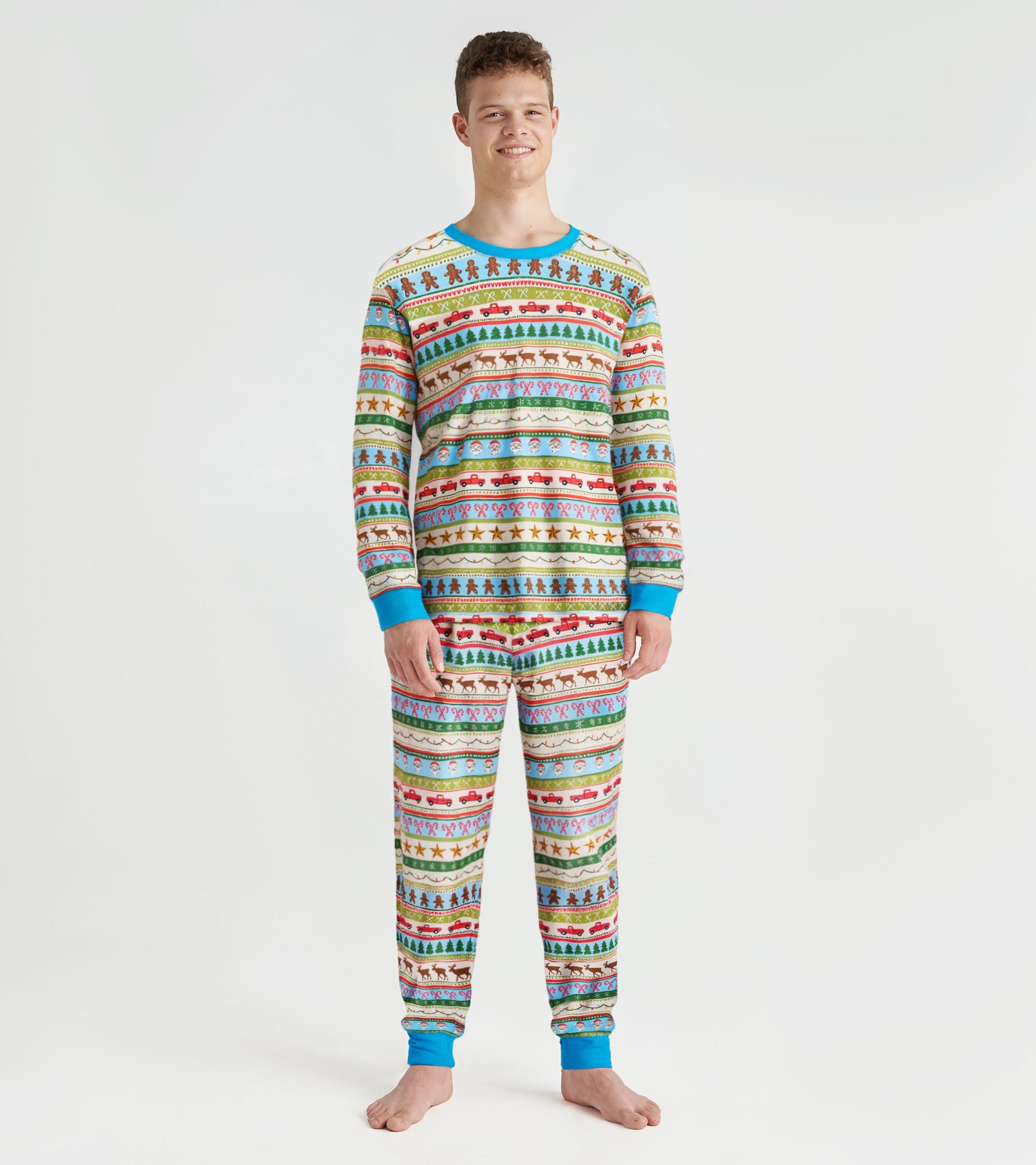 The Men’s Blue Fun Fair Isle Cotton Pyjama Set brings festive comfort to winter nights, crafted from 100% cotton for breathable softness. Designed with a cream base, the set features multicoloured holiday motifs such as Santa faces, red trucks with Christmas trees, candy canes, stars, garlands, gingerbread men, and festive ribbons, arranged in cheerful horizontal stripes. Aqua ribbed details at the neckline, cuffs, waistband tie, and ankle cuffs add a playful pop of colour, while a coordinating chest patch pocket ties the look together. The slim-fit trousers include a wide ribbed elastic waistband with a functional drawcord, front slash pockets, a back patch pocket, and ribbed leg openings for both comfort and convenience.