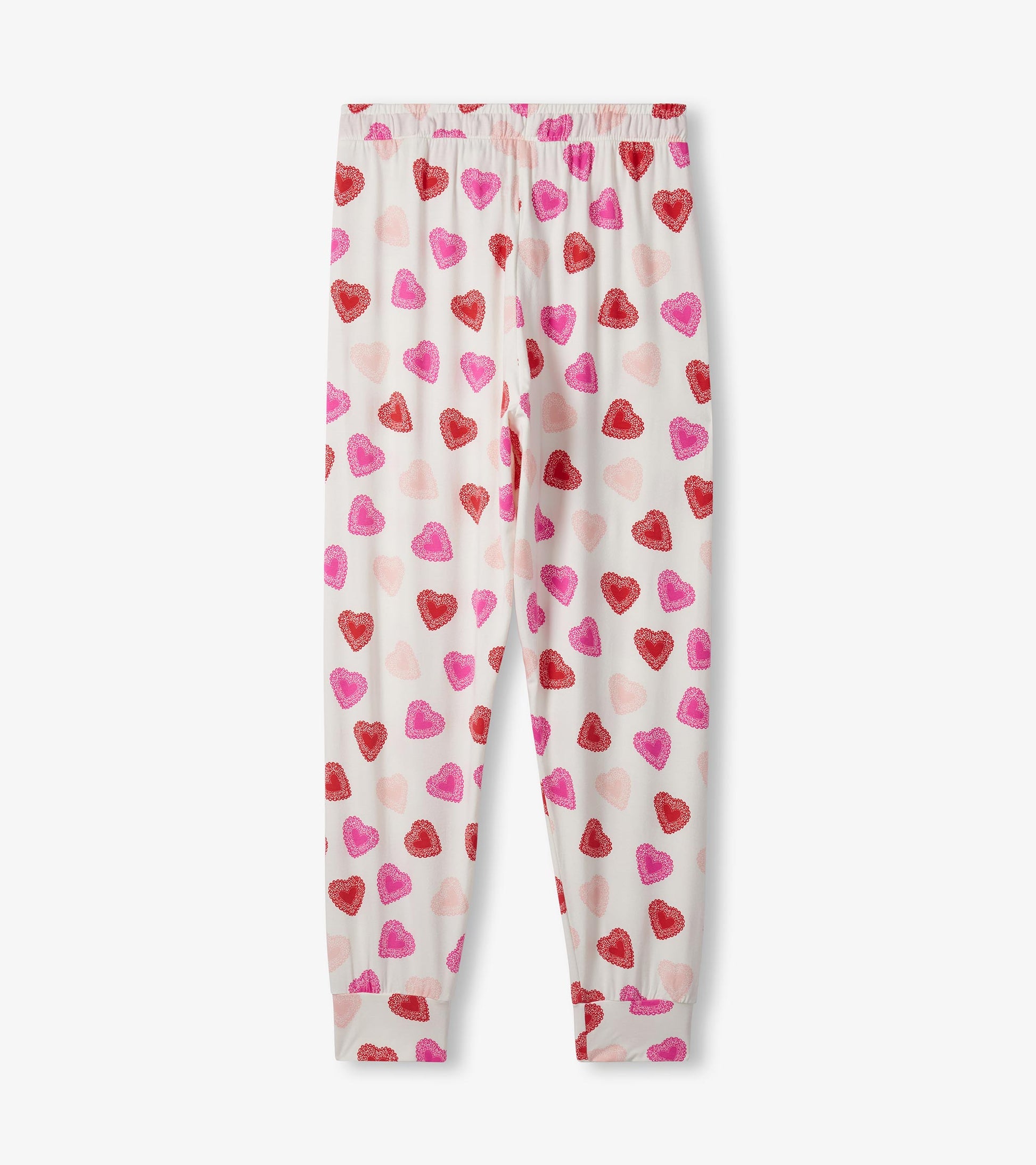 The Women's Cut Out Hearts Bamboo Pyjama Set in Natural wraps you in love and comfort with every wear. Made from ultra-soft stretch bamboo, this cozy set features a relaxed leg fit, cuffed ankles and wrists, and a shirred waistband that flatters and moves with you. A bold red wide twill drawcord adds a charming contrast to the natural backdrop, which is adorned with delicate doily-style hearts in light pink, dark pink, and red. Romantic and breathable, it's the perfect set for lounging in heartfelt style.